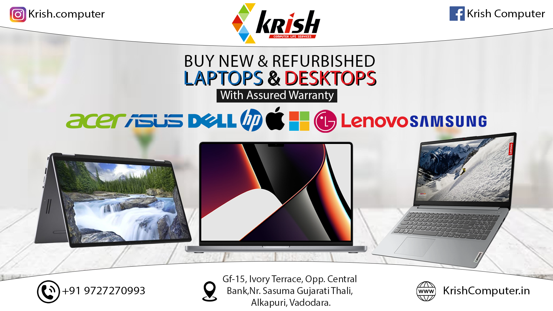 Krish Computers began as a laptop repair store in 2008. After building a solid reputation in Vadodara, we opened our first retail store in Sayajigunj in 2014. As we grew, we expanded to a new location in Alkapuri in 2020. Krish Computers offers professional computer repair services and is a top dealer for refurbished laptops, New Laptops and computer accessories. Our team specializes in laptop/desktop repairing and is trained to troubleshoot and fix systems from Dell, Acer, HP, Asus, and Lenovo, including Windows 7, 8, 10, 11 and Apple MacOS. For over a decade, we’ve committed to professional service and customer satisfaction.